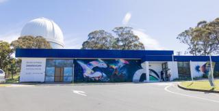 The new mural at the SSO Exploratory was finished in time just three days before Open Day and is a fascinating sight. Painted in bright colours by Digital Artist Carl Knox (OzGrav) from Melbourne, it weaves together traditional stories of the creation of the world with the modern research into the creation of stars and galaxies carried out at SSO. The rainbow serpent emanates from a green lake and makes the land, represented by the ridge line of the Warrumbungles, and the water, represented by the Castlereagh River that begins in the Warrumbungle National Park. While the rainbows represent spectroscopy as the principal research tool of optical astronomy, the serpent slithers between the Pleiades and the Pillars of Creation, whilst seeing the world through glowing eyes, which at close sight, are revealed to be accreting black holes.